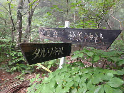 ピークを越えて坂を下る。すぐに登り返せば間もなくタルワキ沢からの分岐点に合流した。ここまで長い行程だったが、ようやく安心できる道に出会った感じがする。合流点を出発、ここの注意書きには「技術、体力の無い方は引き返すように」と案内されていた。技術は無いがまだ体力は残っているので更に登山を続ける。