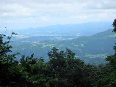 岩を眺めながら更に進むと中間道の中間点の本読みの僧を通過する。これで自分の居る位置を確認することができた。更に中間道を西へ進み、妙義神社へ2.3km、中ノ岳神社へ2.5kmの案内を過ごす。この先で眼下に街並みの展望が広がってきたが、一体どこが見えているのか解らなかった。