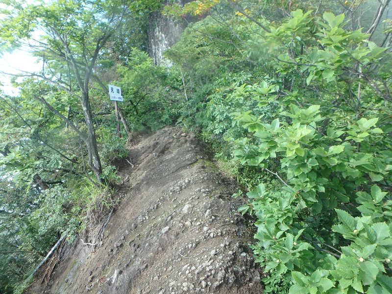 眼下に絶壁を眺めながら岩場を乗り越える。まさにあっと、言えば命が無くなるというのも頷けそうだ。このところの案内は相馬岳と書かれており、この案内には安心感がある。やがて玉石と書かれた地点へ到着、この案内に従い進むと大きな丸っこい岩を見ることができた。玉石の先で一旦高度を下げて登り返す。