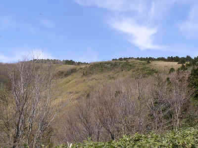 2007年 4月30日 蒜山三座縦走 下蒜山山頂から中蒜山山頂へ 中蒜山U 参考コースタイム 下蒜山 →0:40→ 昔の境界標識 →0:10→ フングリ乢 →0:40→ 塩釜冷泉分岐 →0:15→ 中蒜山 全歩行時間 1時間45分 下蒜山の登山口犬挟峠を出発、素晴らしい展望とカタクリの花に感動しながら下蒜山に到着、次の目的地の中蒜山に向けて出発する。下蒜山から足下にカタクリを眺めながら笹の広がる坂道を下り、背後の下蒜山を振り返ると周囲の笹がきらきらしているのが印象的だ。