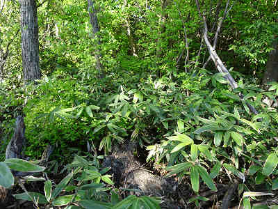 石段を登り観音堂へ参拝、左には鐘突堂も置かれていた。広く平坦な観音堂から中山山頂へ向かう。中山は観音堂から北に位置しており、笹や樹木の茂る中に入る。