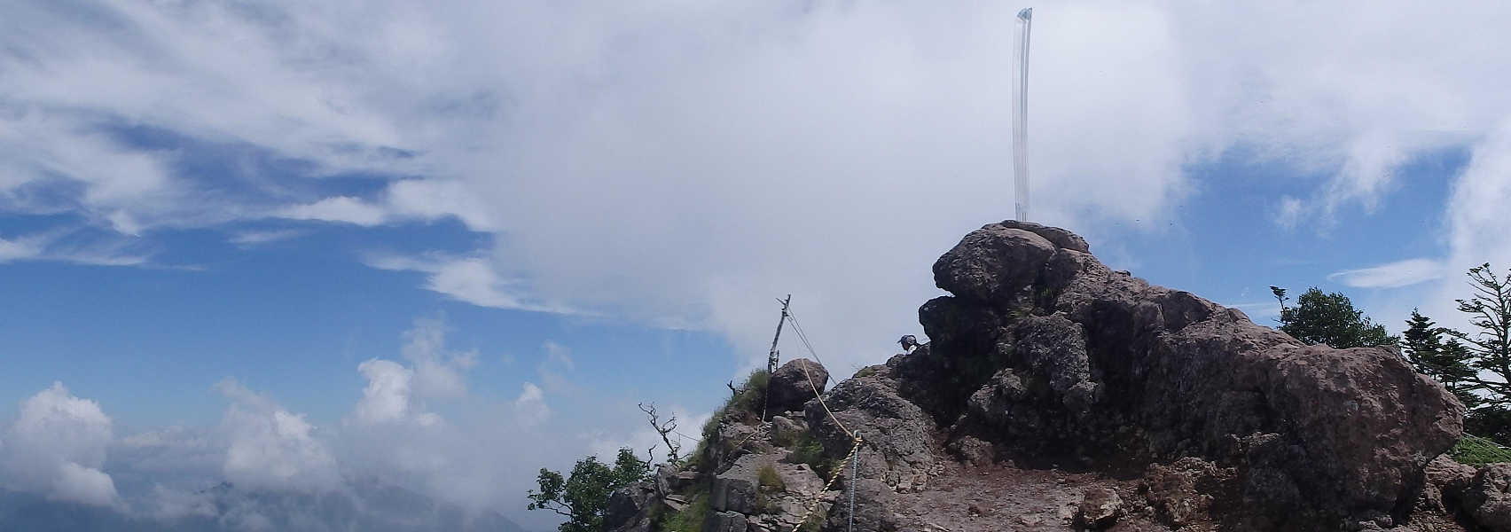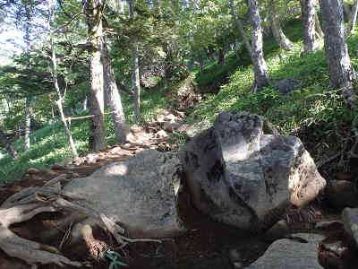 やがて5合目の横に小屋を過ごし、左右に笹の茂る登山道を登る。道の左右にはパイプの渡された場所もあり、足下には小石が目立ち始める。坂の傾斜はすぐにきつくなり、ガレた岩場が続くので、落石を起こさないよう神経を使う。 南には雲の中に山脈が見えているが、山名までは分からない。岩の間を抜ければ6合目を通過、この先しばらく樹林の下を進むが、木の根が露出した道なので躓かないよう足下に注意して高度を稼ぐ。