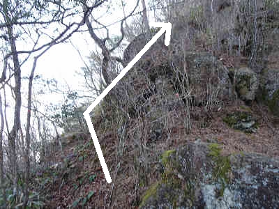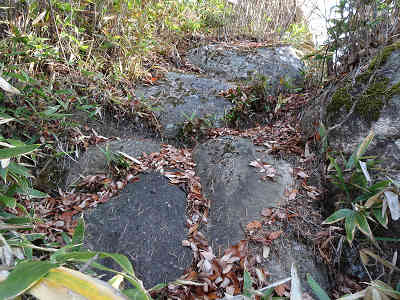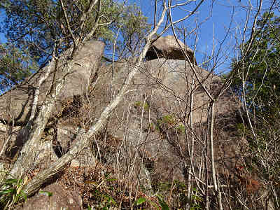 更に一気に高度を下げた後登り返す。やがて尾根上で進路は南に変わり、すぐに舟の形をした大きな舟岩を通過する。船岩の先の左側に「廣實大権現」と裏に書かれた岩を見つけたので観察したが、岩が風化してしまったのか、判読は難しかった。ただし、廣實大権現の先で防□境 慶□二正月三日と彫られていた。