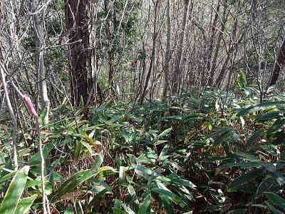 笹の道を進み高度を上げると左右の分岐に着く。右側が平坦なので尾根道と間違えやすいが正しいのは左である。ピークから一気に高度を下げ始めるので不安になるが、東にはこれから向かう二代木山が顔を出している。