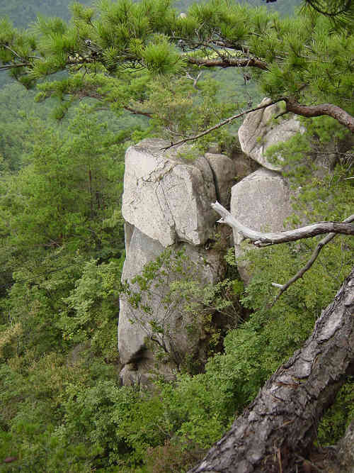 岩の割れ目に沿って登る この岩山には斜めに割れ目が走っており、この割れ目の間に足を突っ込み、両腕で岩にしがみついて体全体を使いよじ登る。なかなか初心者の単独行には難しい関門だったが執念で登りきり、第一のアンテナから10分足らずで無事山頂に向かう岩山の上に立つ。 ここからは待望の「ハイライトの大岩」を見る。この岩を見たいがためにわざわざここまで来たので、感慨無量である。噂に違わぬ素晴らしい大きな岩、確かに人の背丈の倍近くはある見事な岩で、やはり来て良かったと思わせる岩だ。