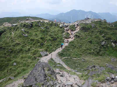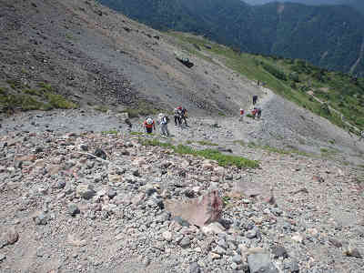 やがて足下には岩が目立ち始め、樹林の下へ続く岩の道を辿る。周囲の樹林は相変わらず背が高く、展望は皆無である。大岩を鑑賞し、木の根の張り出す道を進んでいると、岩の中に光るものを見つけた。これがヒカリゴケで、展望の代わりにヒカリゴケ鑑賞を楽しむ。 この付近を過ごすと進路は東へ変わり、山腹を辿って南へ進んでいた道は、少しずつ山頂方向へ進路を変える。足下は滑り易い岩の道に変わり、坂の傾斜が一気に増して、あっという間に高度が上がる。そのまま急登を辿れば、頭上を覆っていた樹林が切れ、前方が一気に開けると同時に、山頂方面を望むことができた。 登山道には不安定な大岩や石が転がっており、とても滑り易いので慎重に進む。南にそびえている端正な山容を持つ山は錫ヶ岳だろうか、美しい山容に元気を頂きながら急登を踏ん張る。青空の下、登山ができるのは良いが、真夏の登山なので日差しはきつい。 それ以上に美しい風景を眺めながら進んでいると、山頂まで500mの案内を通過する。足下は砂礫状態なので、滑り易いことこの上ない。それにしても眼下に広がる錫ヶ岳を中心とした展望の素晴らしさは何物にも代えがたいほど。しばらく美しい風景を眺めながら小休止を取る。 歩幅を少なくして少しずつ高度を上げていると、足下に青いホタルブクロを眺める。眼下を見下ろせば滑り易い道を歩いたことがよく分かる。また、山頂へ向かうにもやはり滑り易い道が続いている。山頂まで300mの案内を通過、足下にお花畑を鑑賞しながらゆっくり岩の目立つ道を進む。