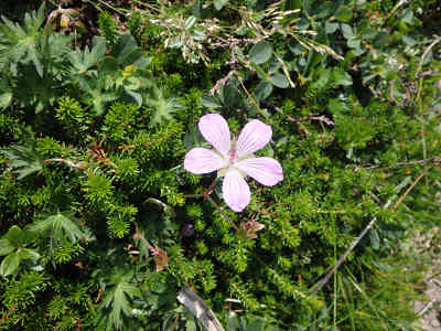花を観賞 再び山頂を踏み、元来た道を引き返す。滑り易い砂礫の登山道を引き返し、森林限界付近でようやく周囲が晴れてきた。この先は慎重に坂を下り、ロープウエイ駅まで下った。登山時に逆光気味だった白根山の写真を撮ろうとしたが、山頂付近は霧に覆われていた。