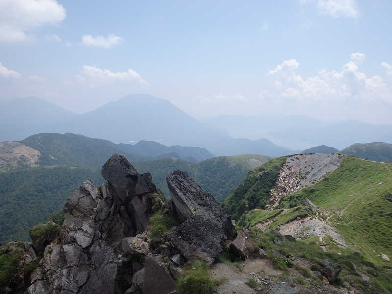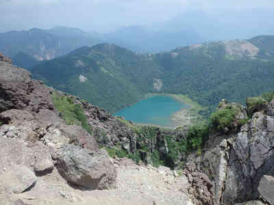 すぐに山頂まで200mの案内を通過、高度を上げる毎に周囲に岩が増えてくる。間もなく左に奥白根神社が見えてきたので参拝、登山の無事を祈願する。北には山頂が見えており、もうわずかで登頂完了である。 山頂へは一旦下って登り返す(クリックで拡大) 賑やかな山頂(クリックで拡大) 一旦坂を下って岩場を登り返せば、日光白根山の山頂へ到着した。山頂には二等三角点がおかれ、山頂標識の前で記念撮影。狭い山頂なので山頂付近だけがラッシュアワー状態である。眼下にはエメラルドグリーンに輝く五色沼が美しく、南東には中禅寺湖、その上には霞の中に男体山がそびえている。 五色沼と男体山(クリックで拡大) 山頂で小休止の後、北東方向へ向かい、弥陀ヶ原へ至る道へ少し入ってみた。ここから山頂を振り返ると、山頂は岩でできており、それも絶壁に近い場所にあることが分かった。眼下に美しい五色沼、男体山や中禅寺湖などを眺め、下山を開始する。