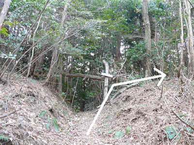 少しの傾斜の坂を進むと、立派な石垣が見えてくる。この広く平坦な場所は住居跡かも知れない。この付近には平坦な場所が多いようだ。ただし、現在はイノシシのヌタ場になっている。間もなく炭焼きの跡を過ごし、緩やかな傾斜を進めば、峠へ着く。韮草山へは右に進路を採り、快適な尾根道を進む。