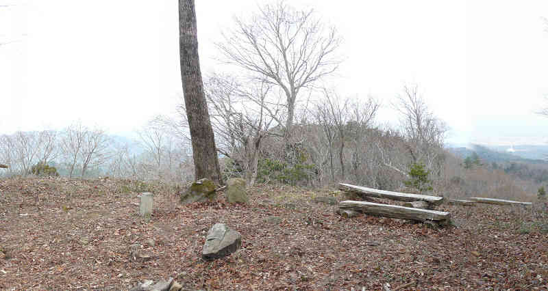 坂を登れば広く平坦な山頂に到着、韮草山には一等三角点が置かれており、とても大きな標石を確認した。三角点付近からの展望は木の間越しであり、ほとんど展望は望めない。案内にあるとおり、西峰の展望地大広間へ向かう。案内には三角点から100m、2分と書かれている。