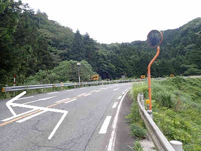 宗頭交差点を右折し国道191号に入り、白拍子トンネル方面へ進む。左に追い越し禁止の標識を見て右の駐車地に入り、車を置いて登山開始。右にカーブミラーのある場所の反対側が林道日尾線だが、案内は錆びてよく見えない。