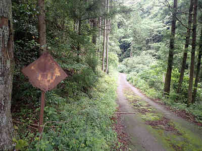 登山口は東側が白拍子トンネル手前の林道日尾線の奧で、西側は民家のブロック塀に緑色の字で「祈る交通安全」の案内のある反対側の獣除けフェンス。高度差を考えればやはり東側の方が楽そうなので、白拍子トンネル手前の方に決めた。