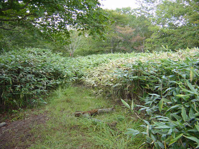 山頂は笹の原となっており中国山地の中央に位置しているにもかかわらず広島湾の島々を見ることができた。山頂には背丈ほどの笹藪が残っており、山頂標識と三角点は雑草に覆われていた。