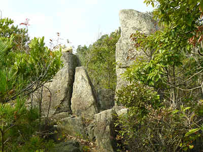 周囲に岩が目立ち始めれば、少しずつ高度が上がり、やがて補助のロープを伝って岩場を登ると、大岩の横に出る。ここではまず背後に南方面の展望が開け、防府市街や楞厳寺山等が一望である。そのまま進むと、すぐに丁字路へ突き当たる。
