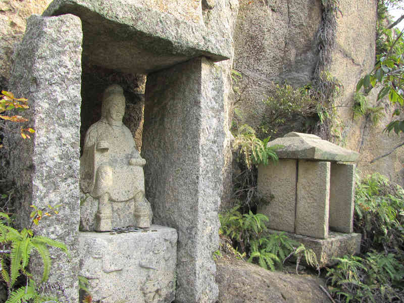 左右にシダの残る道を進むと一本の石柱が立っている。中島篤巳先生の山口県の山(山と渓谷社)によれば、この石柱は倒壊した鳥居の柱とのこと。更に進むと第一ピーク下には左に役行者、右に蔵王権現の祀られた石祠が祀られている。