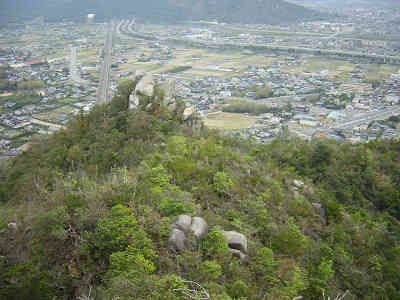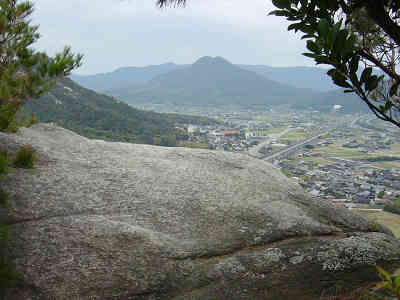 楞厳寺山が見える しばらく展望を楽しみ写真を撮って下山を開始することにした。すると先ほどのパーティーが第四ピークのところであまりの急坂にびっくりして勝坂ルートで帰ろうかと協議をしていた。そこで一旦第四ピークを降りて緩やかな道を探すと南側に別の道があったので教えた。結局このパーティーは大日ルートで帰ることにしたらしく、ゆっくりと第四ピークを降りだした。 遠くからこのパーティーが大丈夫なのかを見ながら降りることにした。ゆっくりと降り始めたので、景色を楽しんで降りることができた。ロープを使ってへっぴり腰で登ったところをゆっくりと降りて行くと少しずつ第三ピーク、第二ピークが近づき、第二ピークの石祠にお礼の参拝をし、秋葉社にも参拝をして石段を下りて登山口まで戻った。 下から見ると西目山のものすごい坂を思い出す。時間があるので新南陽の若山に登ることも考えたが写真を撮りすぎたのでメモリーが無く、そのまま帰ることにした。防府東から高速道路に乗ると雨が降り出してきた。