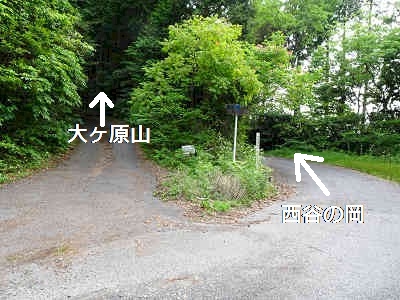 次の分岐を左折し道なりに1.4km進むと左右の分岐に着く。直進は譲羽・久米へ続く林道譲羽線で、左は百谷・米川へ続いている。後ほど登る大ヶ原山へは左道へ進むが、最初に西谷の岡へ向かうため林道譲葉羽線に入り、右にカーブミラーのある場所が広くなっているので車を置いて登山を開始する。
