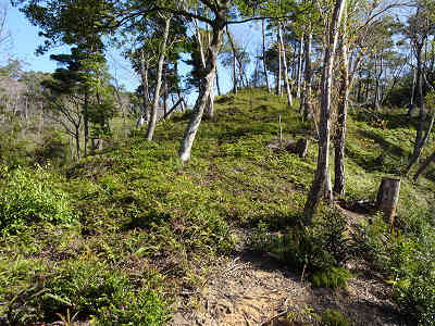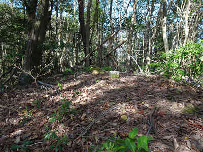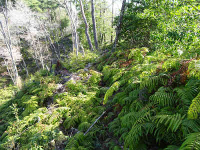 左への分岐を過ごした所で進路が右へカーブし、再び左にカーブした先で右上へ続く踏み跡と目印を見つけた。そこで尾根へ続く斜面に取り付き、尾根へ着けば左折する。