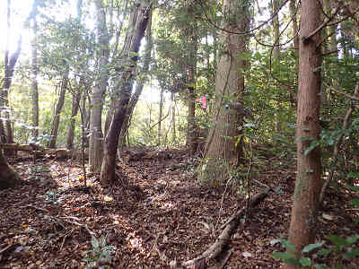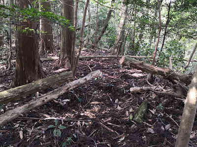 植林の下に続く明確な道を北へ進む。途中で目印のテープは無くなったが、そのまま北へ進み、尾根へ出れば大丈夫。やがて急登を登り切って尾根へ着いた。標高600mの段原山は、着いた尾根を右折すればわずかで着くのだが、私の地図には西の594m標高点が段原山と表示されていたため大失態。そのまま西へ進んでしまった。