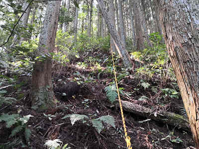 進行方向にはしっかりと目印が続いているため方向を見失うことは無い。急な坂が続くので木を手がかりに高度を上げると西の樹間越しに十種ヶ峰が見えてきた。十種ヶ峰を眺める場所からわずかに高度を上げれば、平坦な植林帯の下に野坂山の三等三角点が置かれていた。