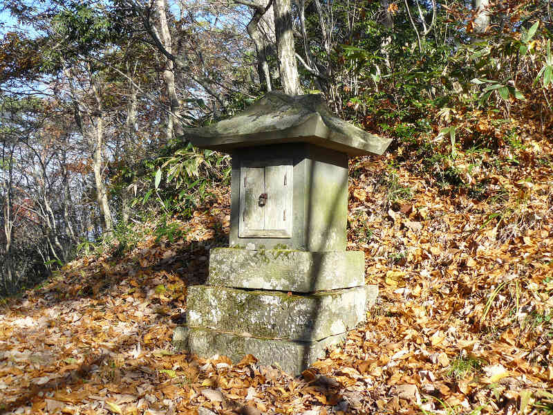 尾根沿いには地積調査の赤い杭が埋められており、この先この杭を目印に高度を上げる。山頂に続く稜線に着き、左右に道が分かれる。ここで右方向へ向かうと麓の案内にもあった祠が置かれていた。中を確認しようとしたが、鍵がかけられているので、お参りだけをして山頂を目指す。