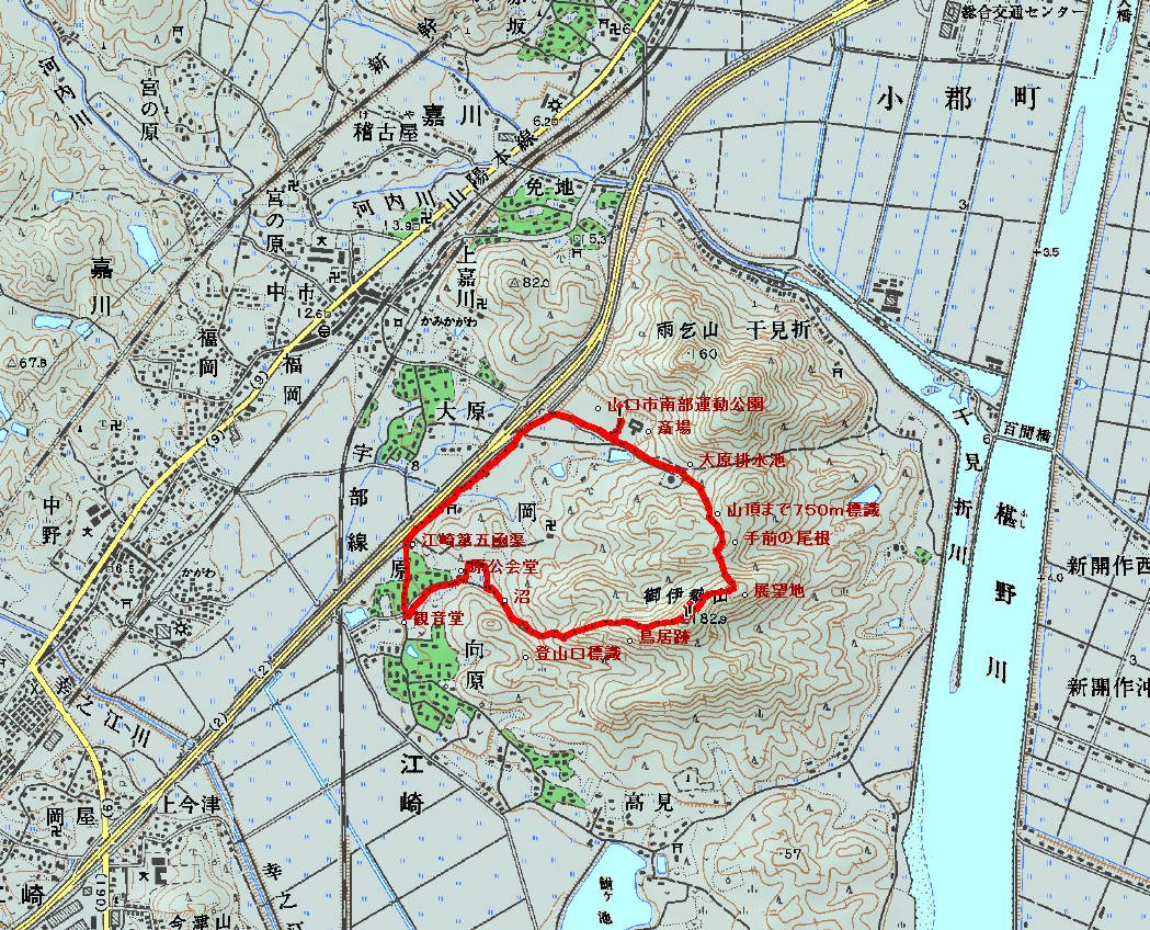 そのまま道なりに進んで行くと正面に国道2号線のバイパスが見えてきたので一安心。少し進むと江崎第5凾渠の標識を見て国道沿いに東に向かう。正面に雨乞山と愛宕山を眺めながらのんびりと歩いて行くともう運動公園への分岐の到着、原公会堂からは25分で登山口の運動公園に戻ることが出来た。