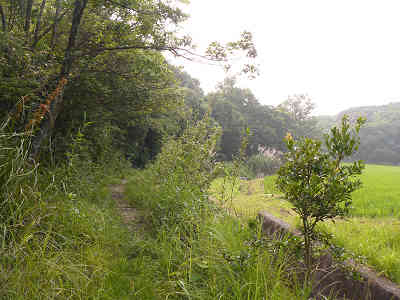 平坦な道を進んでいると、足下に湿地帯を過ごし、左手には沼を過ごすと明るい田園地帯に到着、まっすぐ進むと夏草の勢いが強いので、小さな木を渡り田んぼのあぜ道を通って舗装路に着く。少し進むと右手にお地蔵様を過ごした先の左手に、原公会堂を見つけたので入って行くと、この公会堂の奥から御伊勢山への登山道が続いていた。