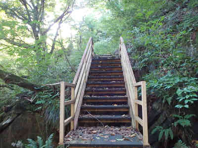 小鹿渓探勝歩道は更に上流へ続き、階段を下り大岩の間を進む。渓谷美を鑑賞しながら歩けば、木々の間からこぼれる木漏れ日が清々しい。遊歩道に整備された階段を登り、樹間越しにまるで絵画のような小さな滝と清流を眺める。