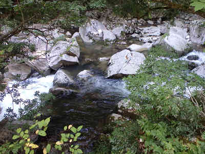 上流へ向かうと美しい淵へ出る 青葉と清流と岩で構成された晩夏のシーンはたぶん忘れることはないだろう。更に階段を登れば、無雑作に岩の配置された渓谷へ着き、更に上流へ向かえば、広い淵へ着いた。穏やかな流れの淵はとても落ち着きのある風景で、紅葉シーズンにはたまらない観光スポットだろう。
