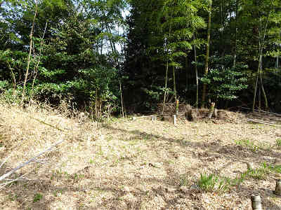 展望地を出発し進行方向に面影山の山頂を眺めながら進み、最後にみかん園の中につけられた道を進むと、竹林の中に黄色の「火の用心」の案内が見えた。この場所が山道への入口で左右に迫る竹林の中に入れば、目印のテープに従い高度を上げる。