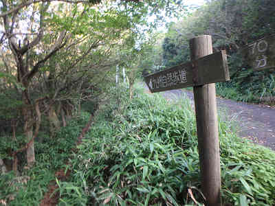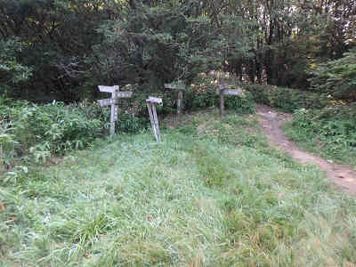 椎原峠は平坦な広場となっており、小休止を取ることができる。峠には多くの案内が立ち、金山まで4km、背振山へ4km110分、一谷へ3km、椎原バス停へ5km、鬼ヶ鼻岩へは20分と案内されている。鬼ヶ鼻岩へ向かって出発、しばらく進むと分岐が現れ正面にはコンクリート舗装の作業道が見えてきた。