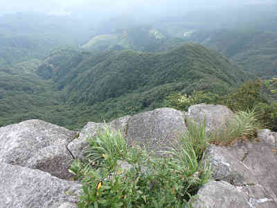 そのまま九州自然歩道をたどり、背振山から5km地点を通過、少しの傾斜を登れば鬼ヶ鼻岩の分岐へ着いた。なお、椎原峠から1km、金山へは3.6km地点である。鬼ヶ鼻岩へ30m2分の案内に従い少し進むと大岩の目立つ展望地の鬼ヶ鼻岩に着いた。