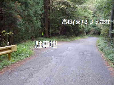 登山口への起点は冠高原の松の木峠で、峠から山口県に入り寂地峡へ向かって約900m下った所の左(南)側にある林道が登山道入口、更に下った所の左側に駐車スペースがあるので車を置いて登山を開始した。なお、駐車地の横に立つ電柱は高根(支)335である。