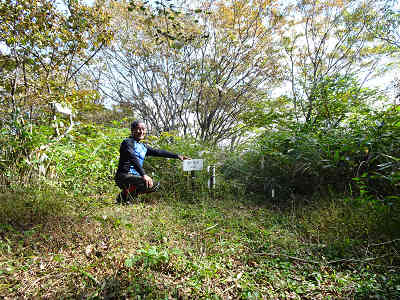 前方に岩が目立ってきたと思ったらとても大きな岩が現れた。この大岩の横を抜けると前方に笹が目立ち始めた、進路はピンクテープにより確認していたが、笹の下には踏み跡が確認できるので目印のテープ無しでも方向を失うことは無い。笹を分けながら高い所へ向かっていると前方に美しい紅葉が見えてきた。