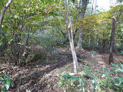 しばらく作業道歩きが続いたが、作業道が尾根から外れそうになったので適当な所から尾根道に戻った。尾根道にはしっかりピンクテープが続き、更に歩きやすいので何も心配はいらない。周囲に広がる紅葉の始まりを鑑賞しながら進んでいると少しずつ坂の傾斜を感じ始めた。いよいよ鬼ヶ城山が近くなってきたようだ。