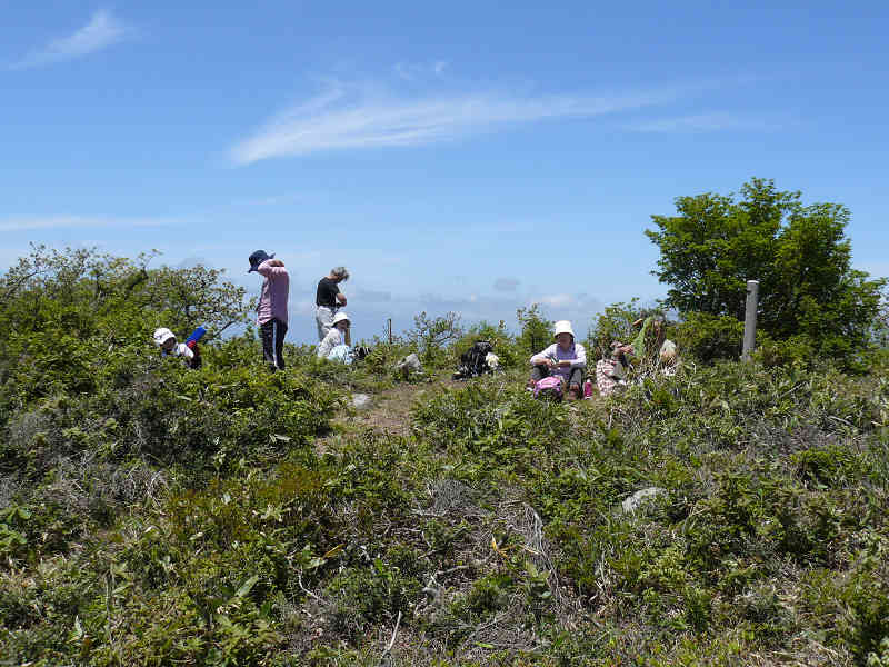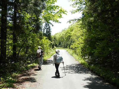 鉄塔下を出発、ほとんど負荷を感じない坂を少しずつ進む。青葉の中に同化しそうな登山者3名である。周囲の木の背は高く、見上げれば青い空。まるで秋を思わせるような、爽やかな風の中で高原散策が続く。少しのピークを下り、鞍部に着くといよいよ登り坂が始まる。