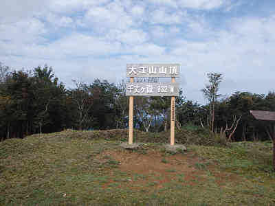 休憩所横から東方面を見晴らすが、遠くの方は雲に覆われていた。案内によれば、秋の早朝、ここから眺める雲海は絶景とのことである。稲荷神社を右に見ながら進むと、やはり右にバイオトイレを過ごす。この先が大江山の登山口で、山頂の千丈ヶ嶽までは1.1kmである。