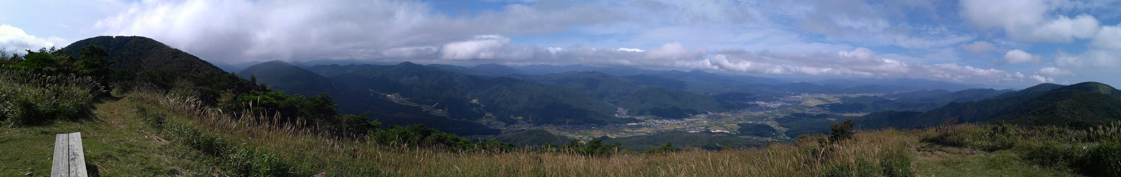 山頂からは周囲360度のパノラマが広がり、西に与謝野町の集落、北に宮津市と天橋立方面、北東に本日の最終目的地の鍋塚などが一望である。小休止の後、ススキの揺れる鳩ヶ峰を出発し坂を下る。すぐに岩の目立つ場所を通過、 足下には不安定な石が目立つ。