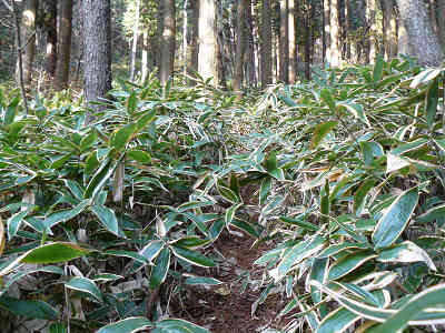 岩の場所を過ごすとすぐに登山道は右に向き、その先からは笹の茂る道となる。少しの笹をかき分けながら進んで行くと突然周囲から笹が消え、歩きやすい檜の植林帯の中に出る。再び踏み後を探しながら直登の道を進むと間もなく明確な登山道が待っていた。