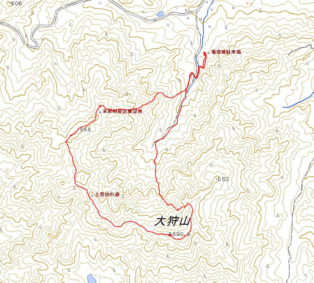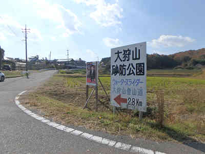 植林帯の下に続く作業道を進むと右に「大谷山国有林分収育林契約分収林」の案内を過ごす。更に植林帯の下に続く道を辿るが、少しずつ坂の傾斜を感じ始める。大狩山へ0.5kmの案内を過ごすと、再び「大谷山国有林分収育林契約分収林」の案内が立っている。