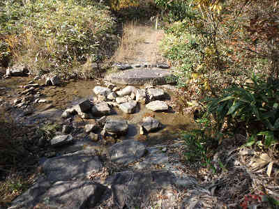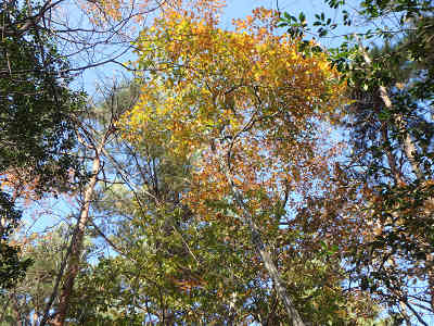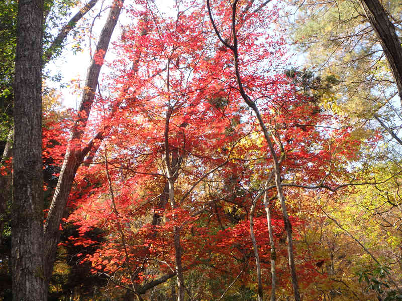 右側に続く擬木階段を下りて道なりに進むと、沢を渡り反対側の作業道に出会う。進路は左へ向き、小さな橋を渡ると頭上に紅葉を見つけた。名残の紅葉を眺めながら更に作業道を進む。