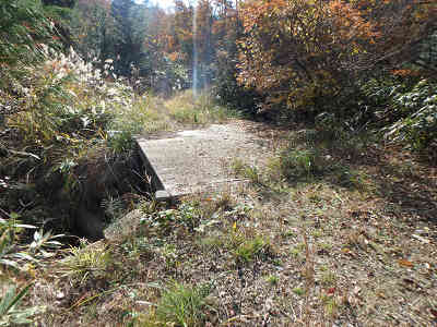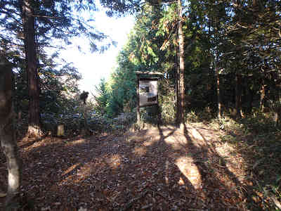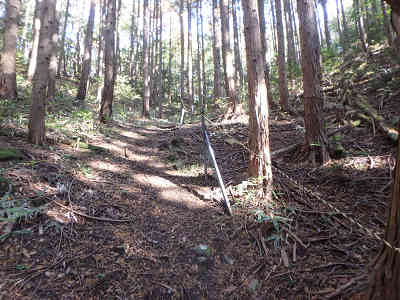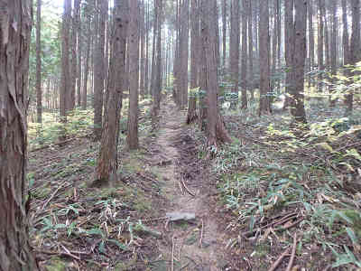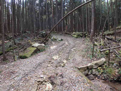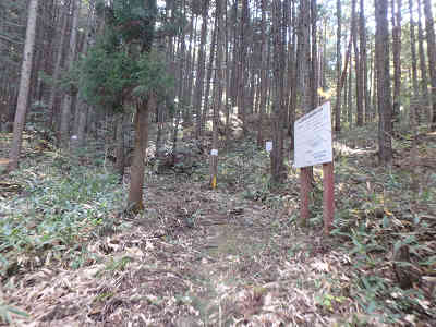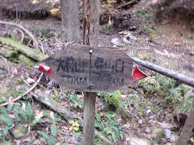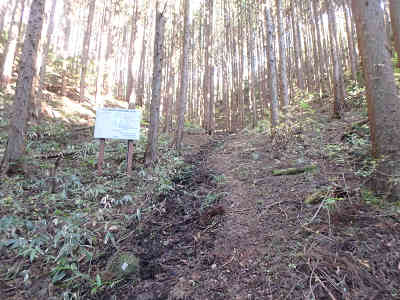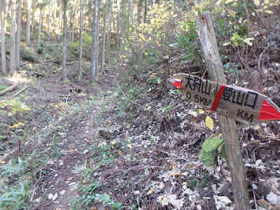 木製の大鍛冶屋跡の案内を過ごすと頭上は植林帯に変わる。足下が荒れ始めたらこの先で左右の分岐となるので左道へ向かう。入口には大狩山へ1kmの案内が置かれているので、見逃すことはなさそうだ。