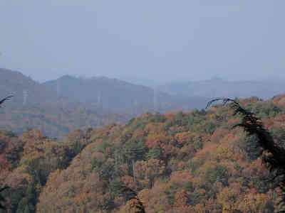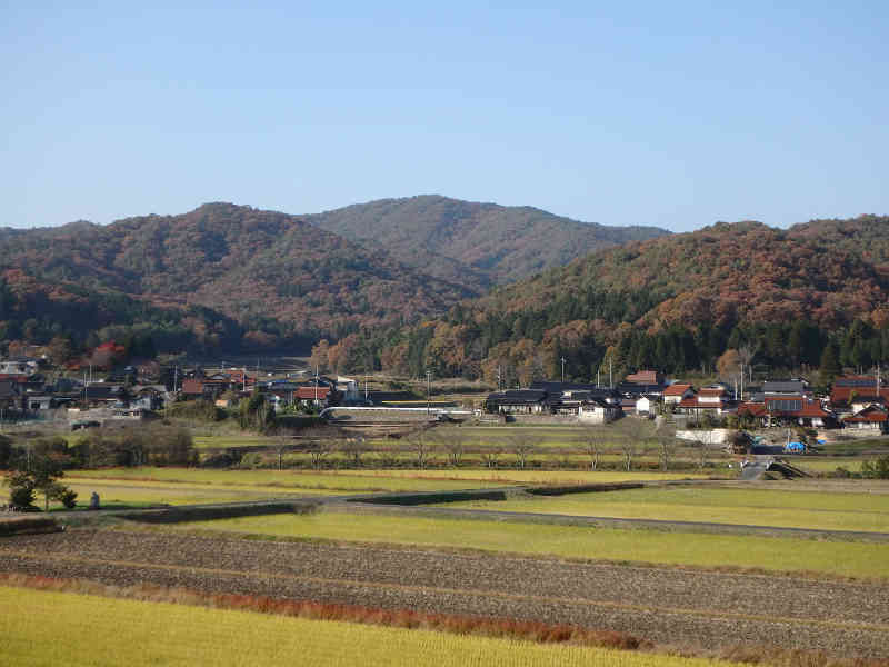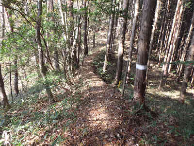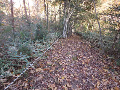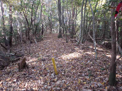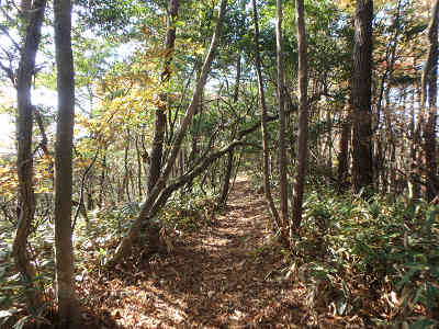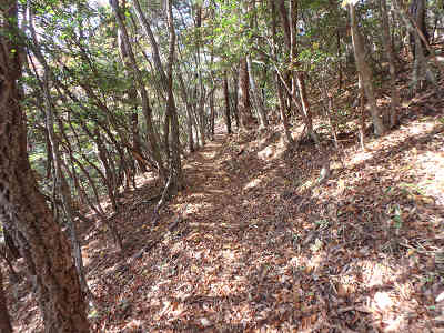 頭上に紅葉など眺めながら明るい道を進む。途中で土塁状の道を過ごせば山腹につけられた平坦な道が長く続く。この付近が尼子道と言われる所だろう。やがて丁字路に着き右道を採る。