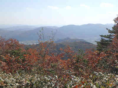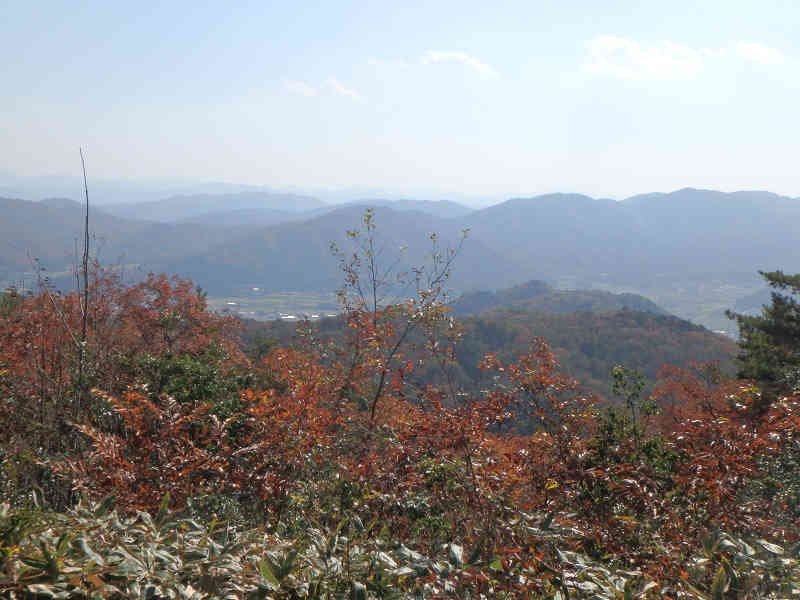 この先から坂の傾斜が増し、補助のロープが渡されている。ここで一気に高度を上げれば、落葉の目立つ尾根に立ち、坂の傾斜は緩やかになる。広く快適な道が続き、紅葉を眺めながら進んでいると、切り開かれた大狩山の山頂へ着いた。