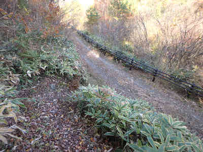 これから先は紅葉を眺めながら下り始め、途中で進行方向の左側に作業道を確認した。足下に大きな岩が増えてくると、この先から急な下りが始まり、ロープを補助に下りていると、登山時に通った作業道へ着いた。もう登山口は間近で、元来た道を引き返し、駐車場まで帰り着いた。