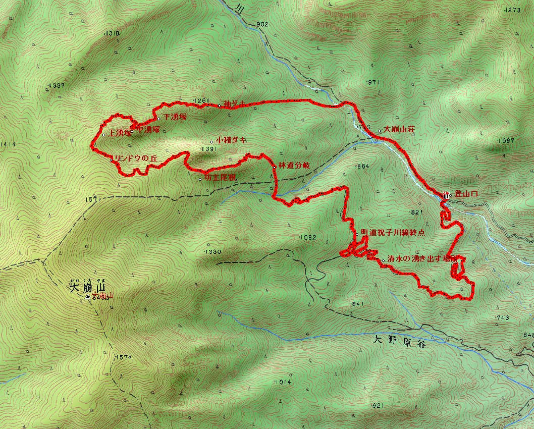 更に25分で清水の湧き出る場所に着いたので冷たい水を飲む。清水の場所から20分で大崩雨量観測所を過ぎ、更に20分で橋に着いた。ただし、この橋は工事中だったので苦労して対岸に渡る。橋を渡ればもう登山口までは3分、無事一周回りで帰ることが出来た。