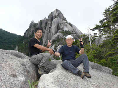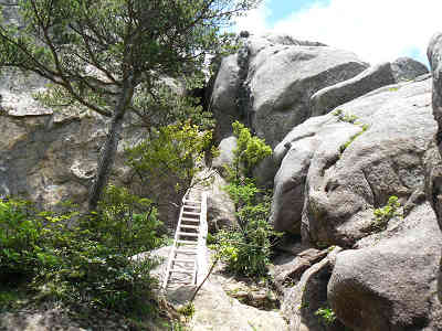 上湧塚へ向かう 岩の道をもう少し進むと上湧塚に到着、荷物を下ろして上湧塚へと向かう。まずはアルミ梯子を登り、その先はロープを伝って岩の間に入る。最後は岩の間を抜けて大岩の上に立つ。この作業はなかなか難しいが、上湧塚の上に立つとその展望に疲れを忘れる。