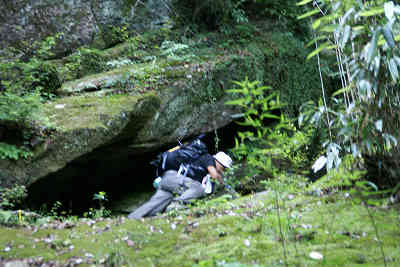 樹林の下に入ると左手には炭焼きの跡らしき場所を過ごし、少し進むと大岩の下に岩屋を見る。岩屋を過ごし更に進むと再び大きな岩屋が現れた。この付近には本当に大きな岩がいっぱいだ。