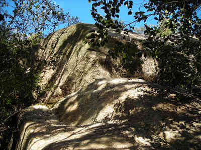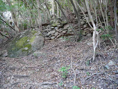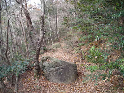 急な階段道が続くのでゆっくり歩きで高度を稼いで行く。滑りやすい道なので慎重に進んでいると、おむすび岩まで0.3km標識を見て小休止、向かいの山腹に大きな岩を見る。岩を眺めることが元気の源のようだ。少し元気を取り戻したので、ますます滑りやすいワイルドな坂に取り付き、一気に高度を上げて行き、岩の間を抜けておむすび岩に到着した。