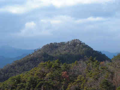 双眼鏡で山頂を眺めると大きな岩を確認することが出来た。数年前にあの岩の上に登り、今向かいの山から登った岩を眺めている。次は別の山からおむすび岩や大野権現山を眺めることになりそうだ。これが山歩きの醍醐味であり、なかなか嬉しい出来事なのだ。大峯山の美しい姿を楽しんだ後、急な坂を下ることになる。